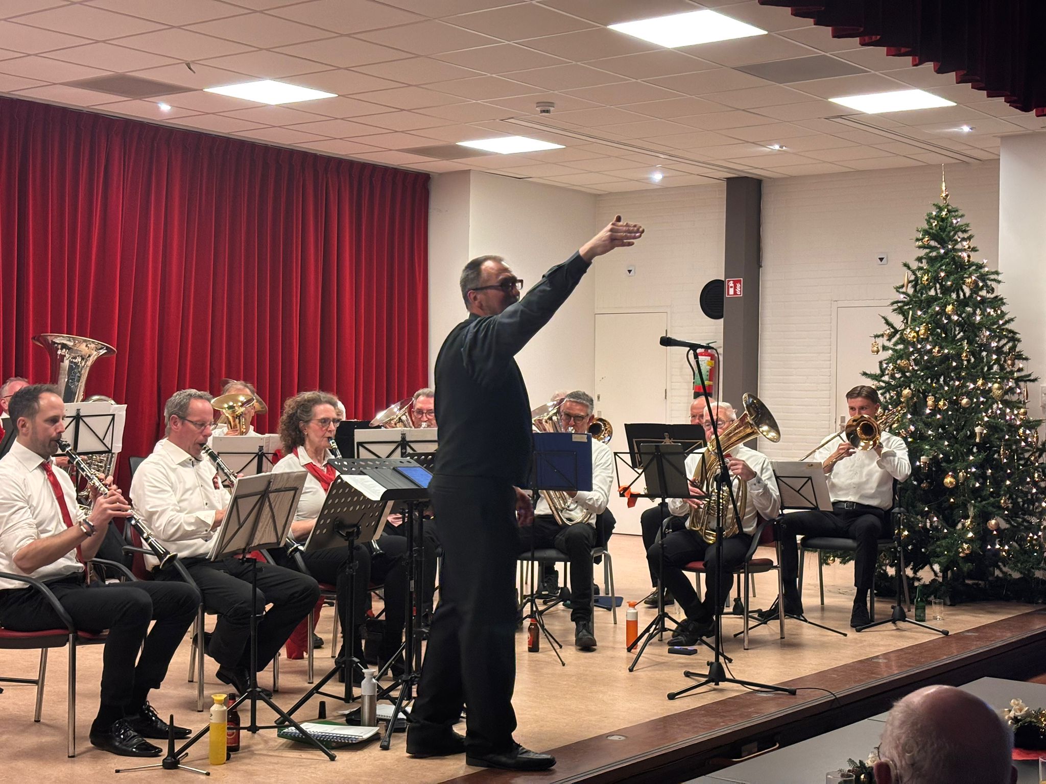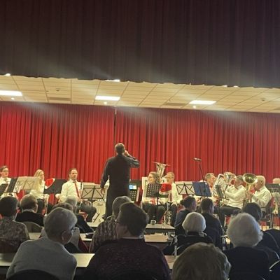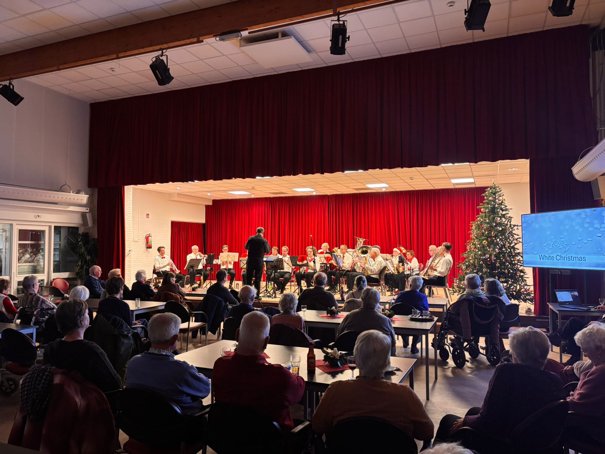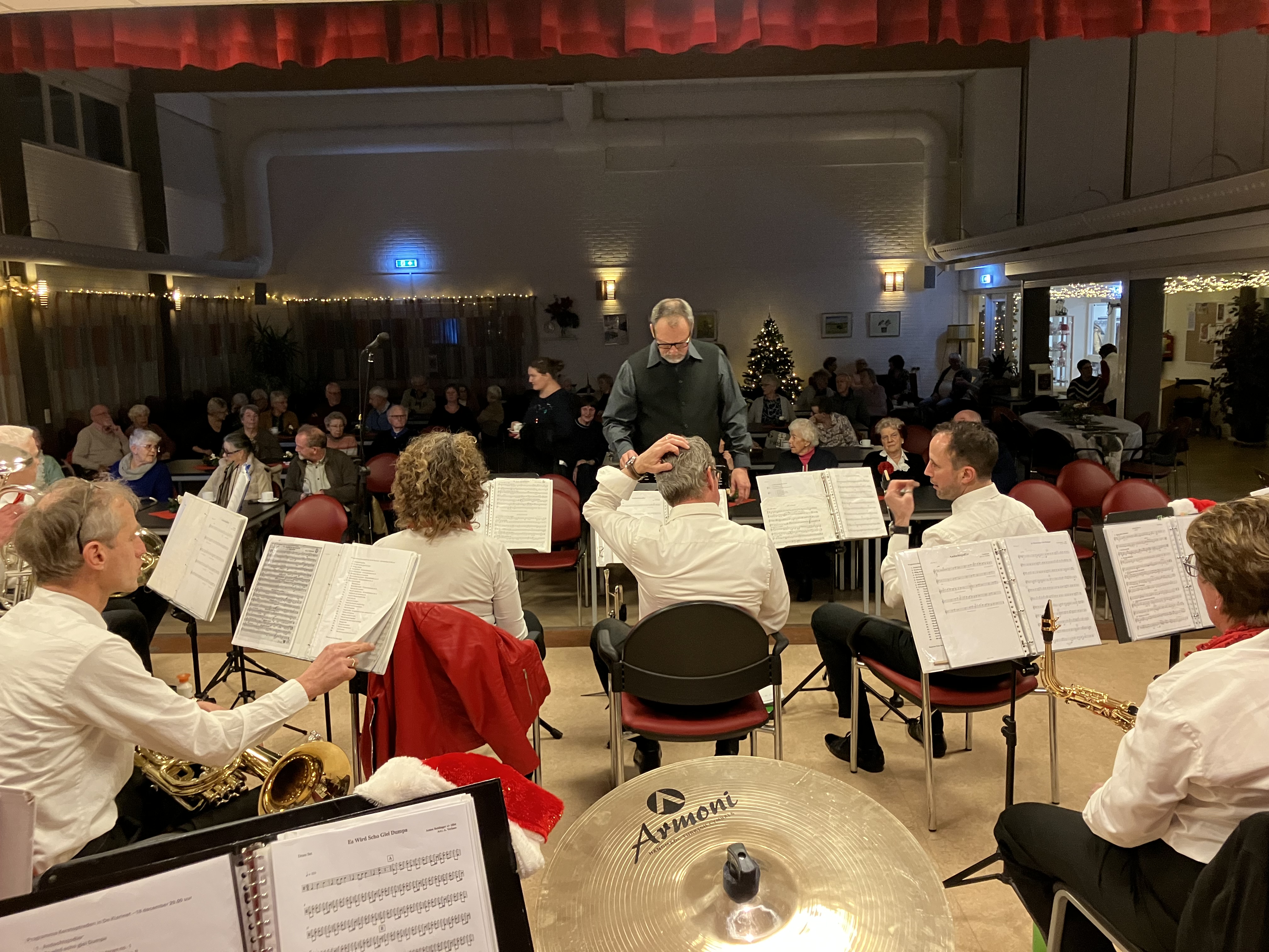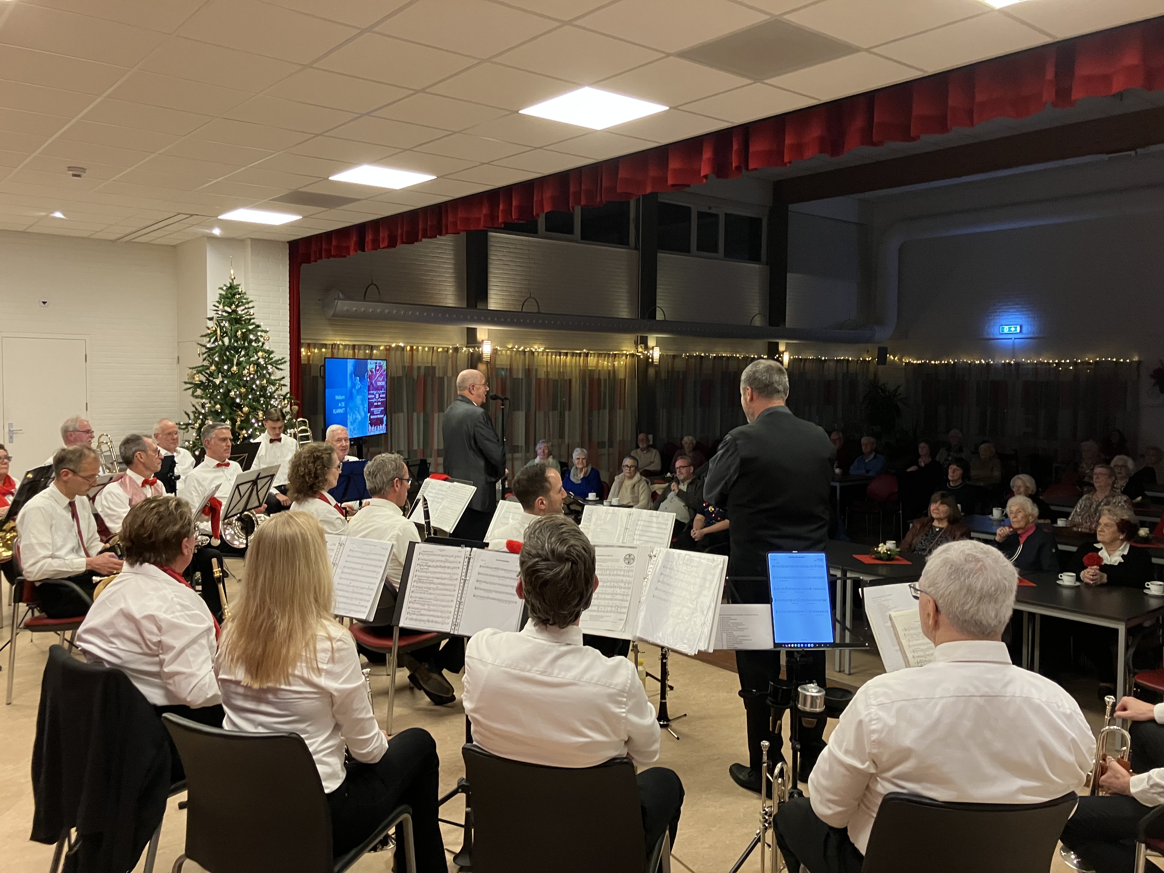 Ook dit jaar was de Eemlander Blaaskapel weer uitgenodigd om in het ontmoetingscentrum De Klarinet op donderdag 18 december 2025 de avond muzikaal te omlijsten met Kerstmuziek. De zaal was mooi aangekleed en zat aardig vol rond 20:00 uur toen de Aandachtsjodler werd ingezet. Er volgden vele bekende traditionele kerstliederen, waarbij de tekst op een groot beeldscherm gepresenteerd werd, zodat iedereen kon meezingen. Na de pauze werden er wat meer populaire moderne liedjes ingezet. In de zaal had een van onze grootste fans zich in een fraai kerstkostuum gehuld en liet de kerstbelletjes klingelen. Het was een gezellige avond.
