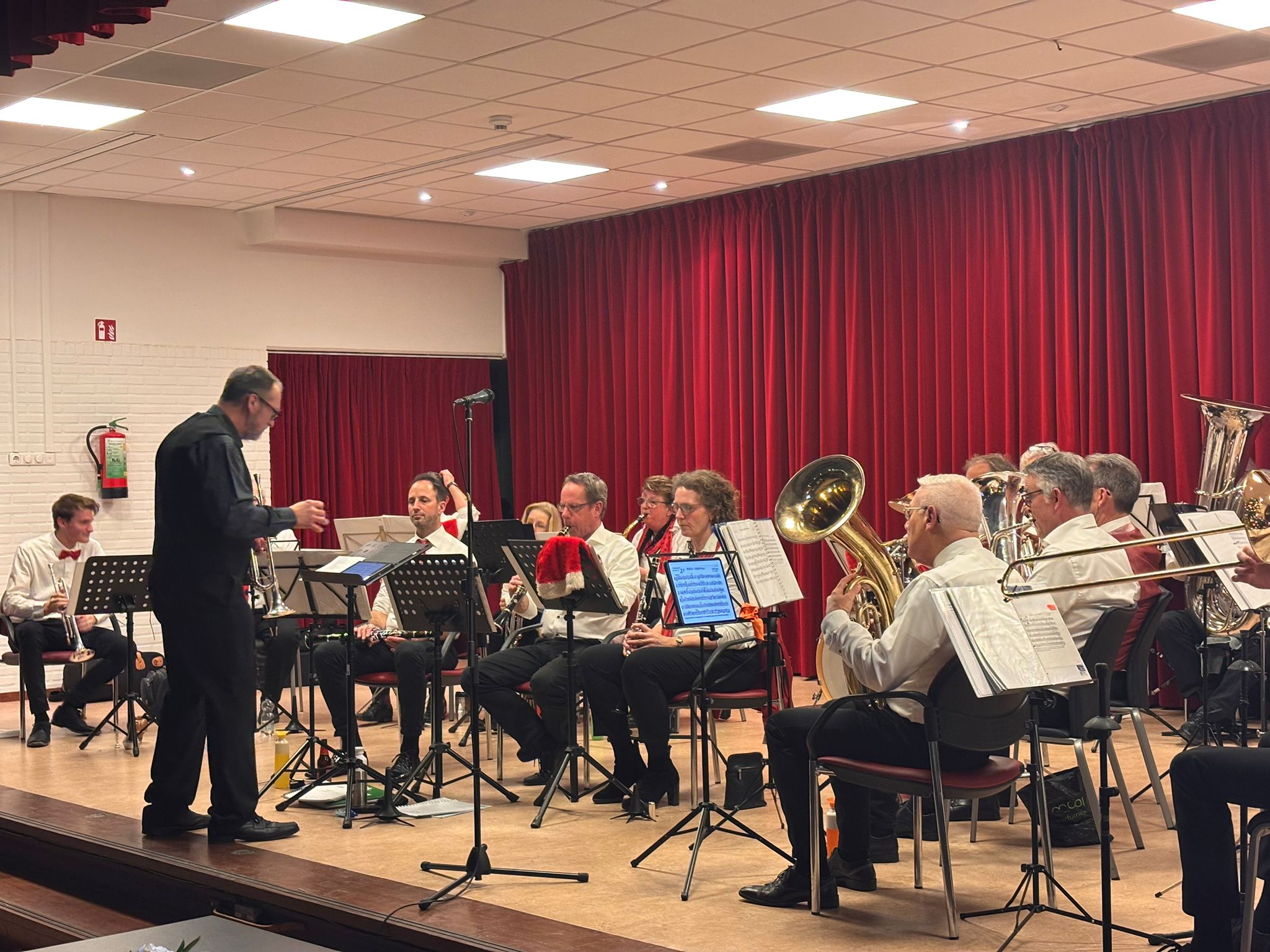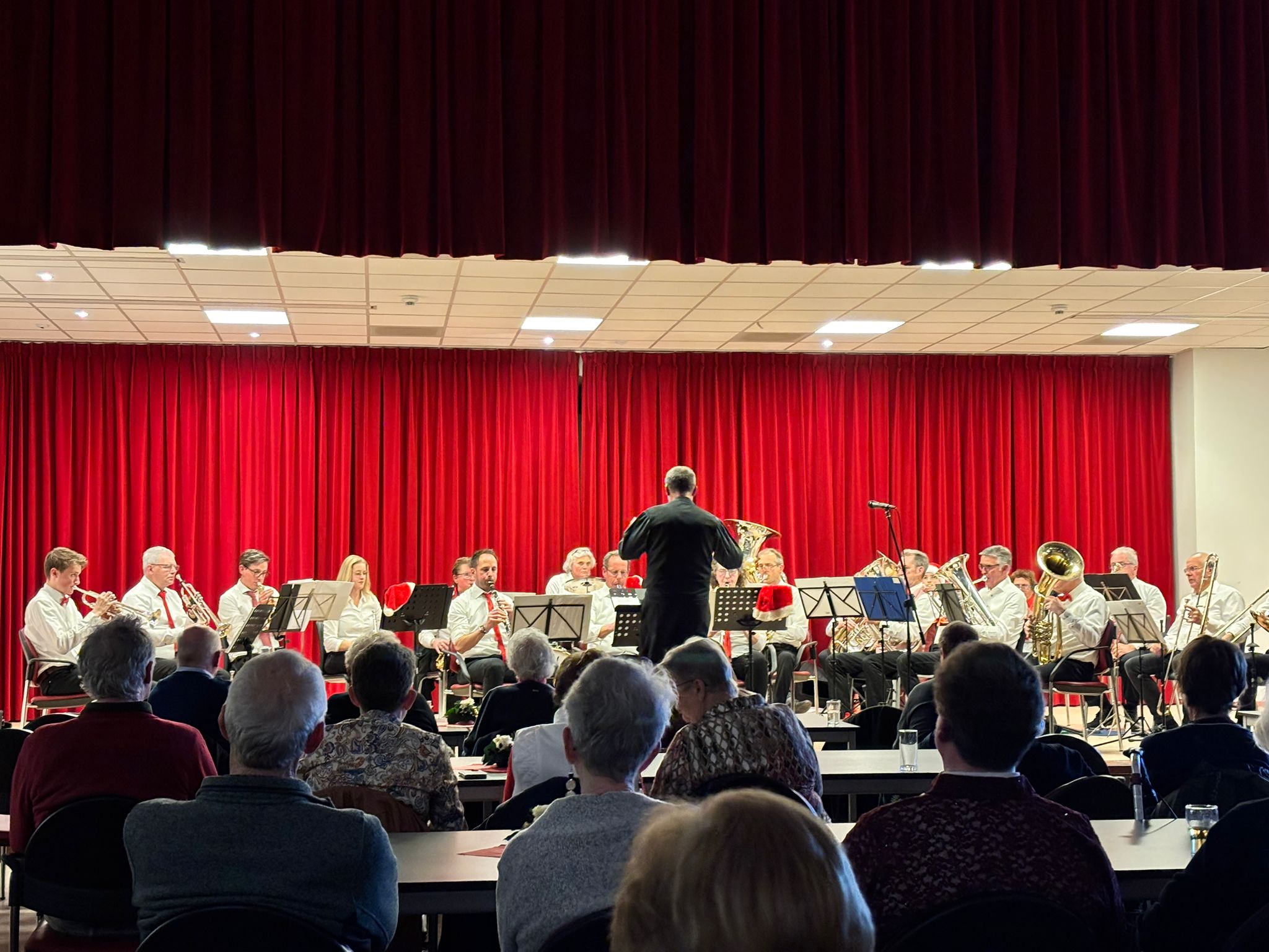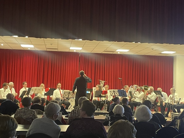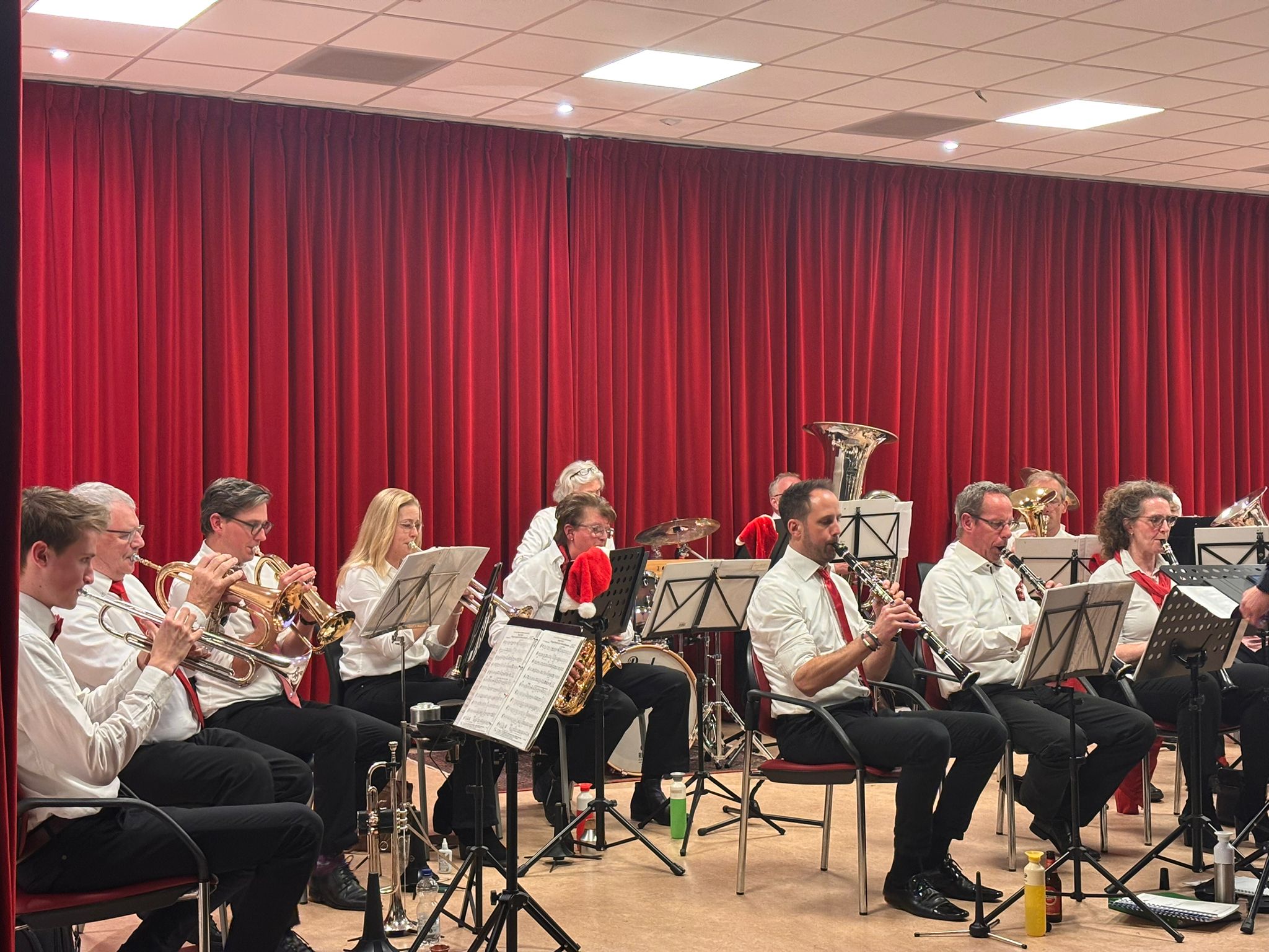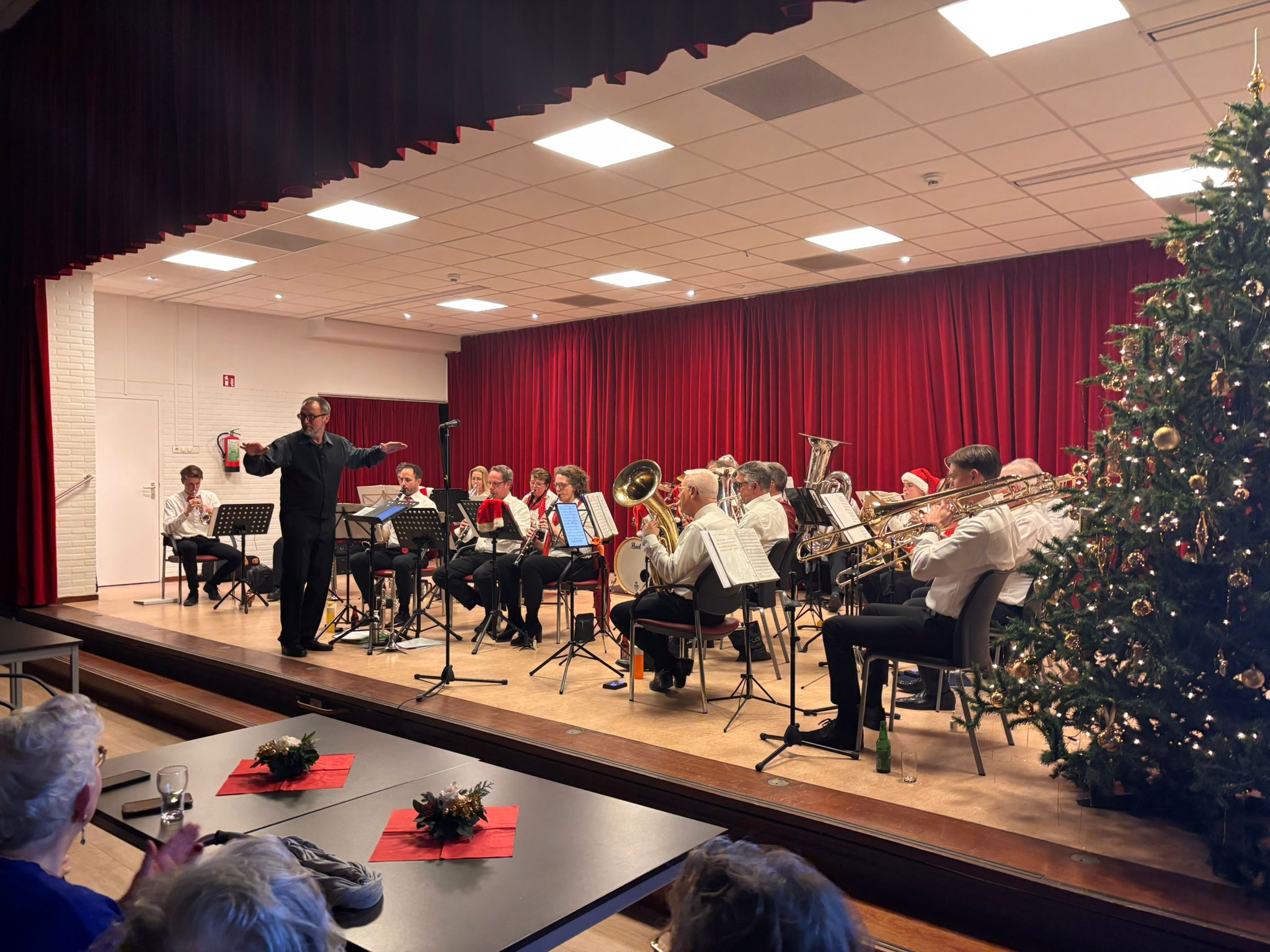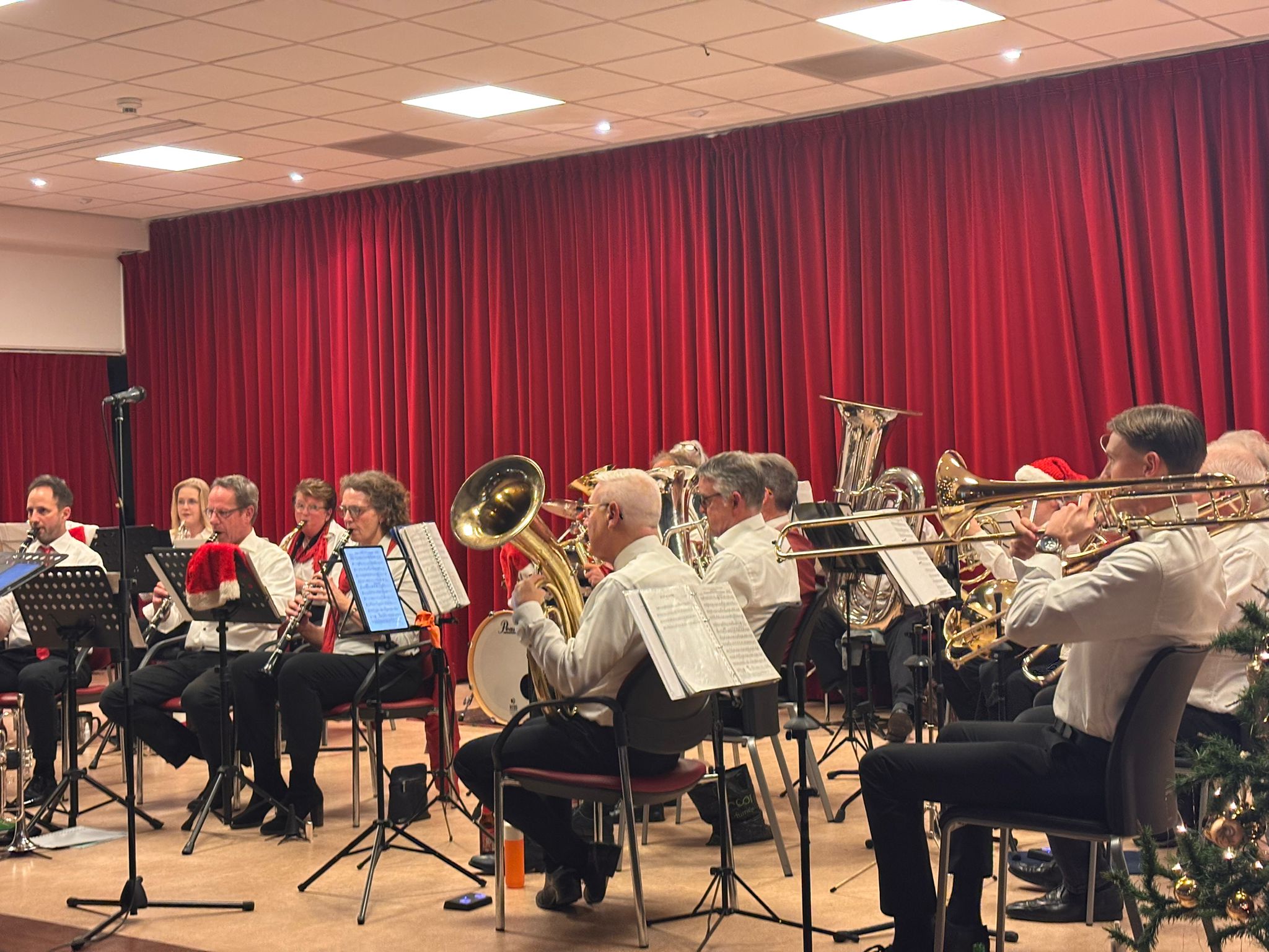 Ook dit jaar was de Eemlander Blaaskapel weer uitgenodigd om in het ontmoetingscentrum De Klarinet op donderdag 18 december 2025 de avond muzikaal te omlijsten met Kerstmuziek. De zaal was mooi aangekleed en zat aardig vol rond 20:00 uur toen de Aandachtsjodler werd ingezet. Er volgden vele bekende traditionele kerstliederen, waarbij de tekst op een groot beeldscherm gepresenteerd werd, zodat iedereen kon meezingen. Na de pauze werden er wat meer populaire moderne liedjes ingezet. In de zaal had een van onze grootste fans zich in een fraai kerstkostuum gehuld en liet de kerstbelletjes klingelen. Het was een gezellige avond.