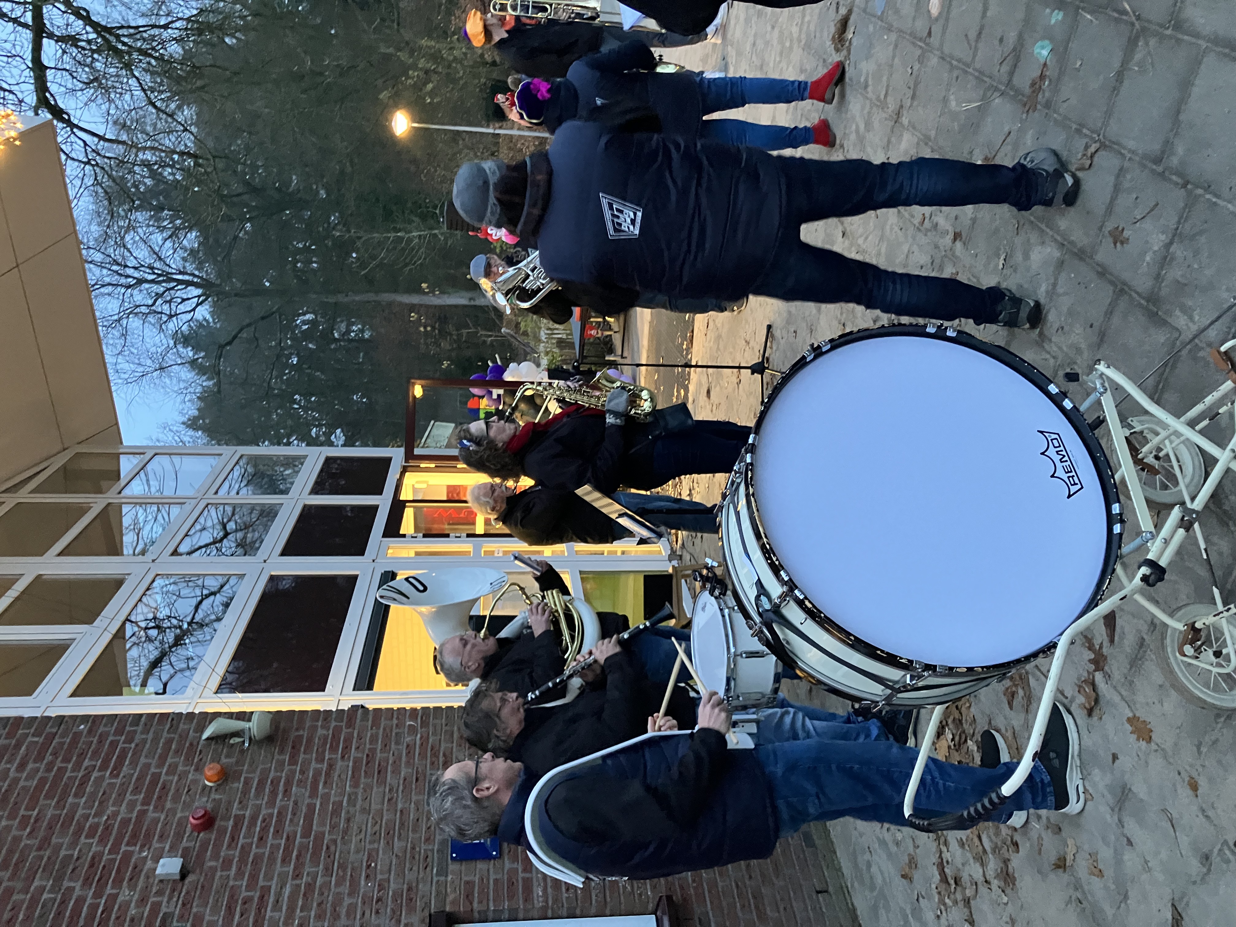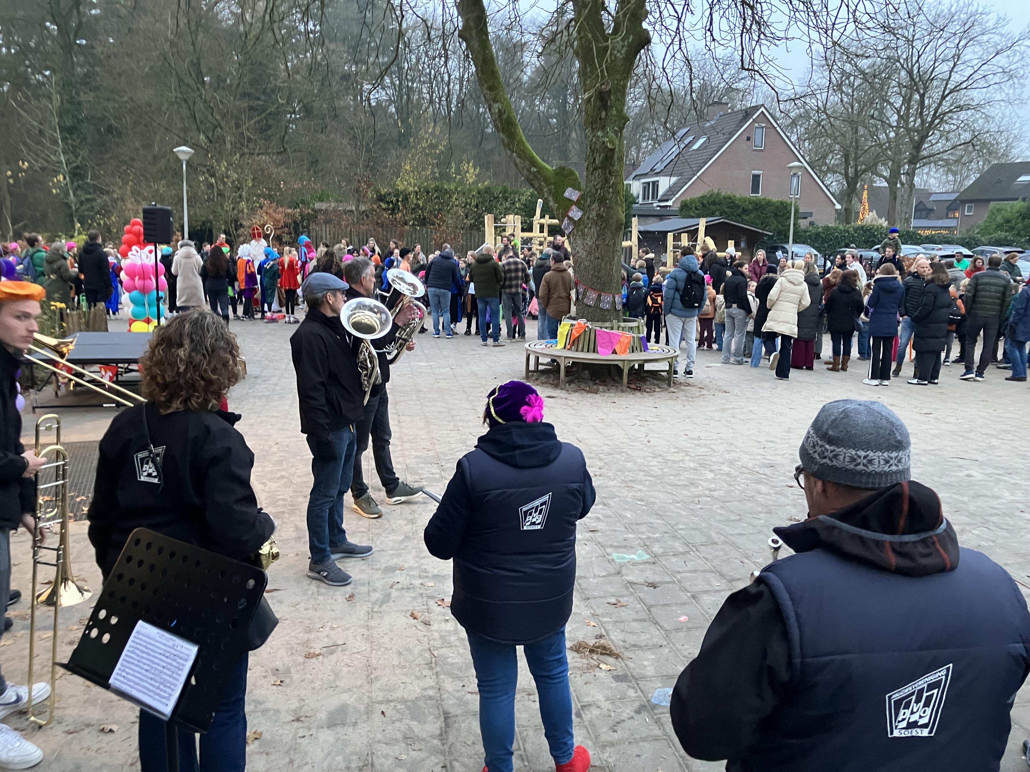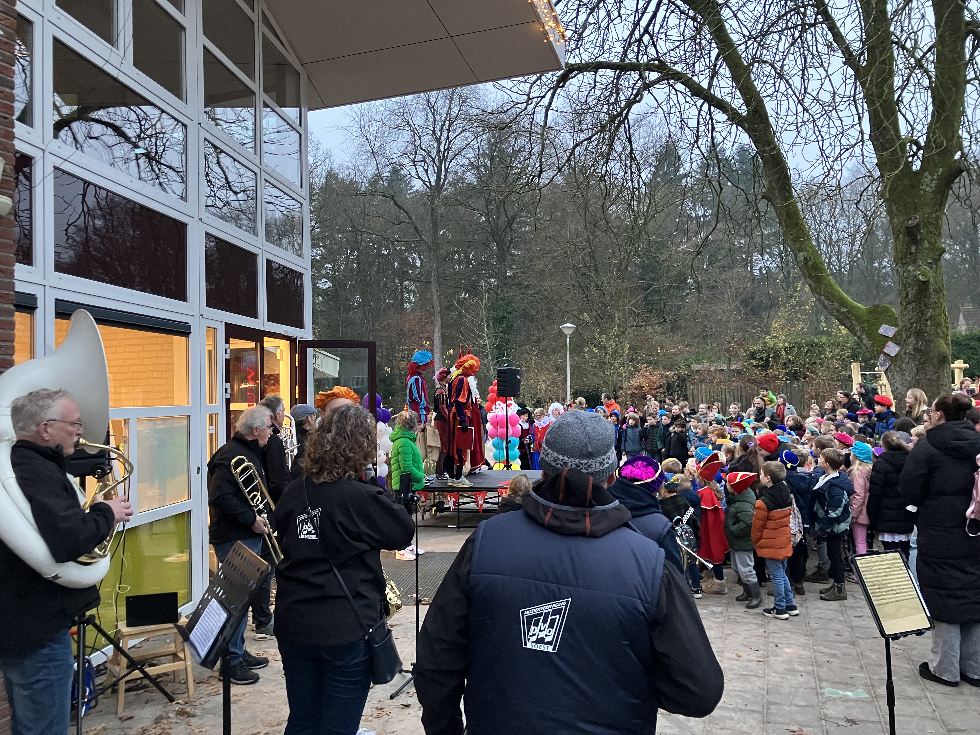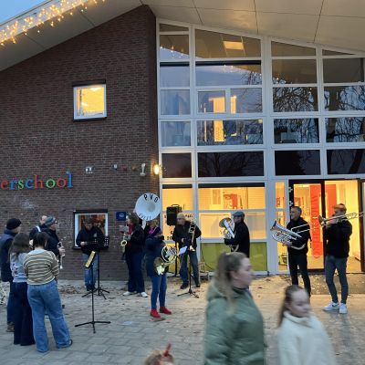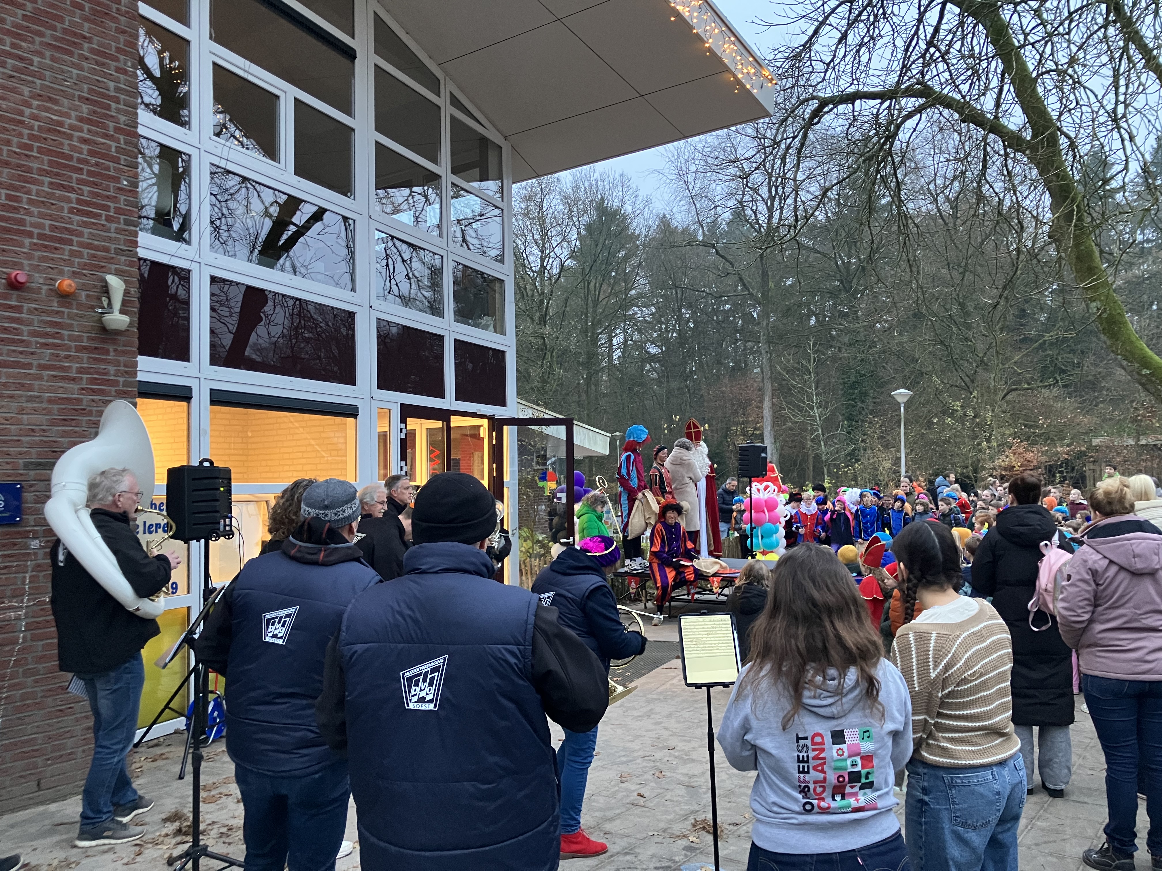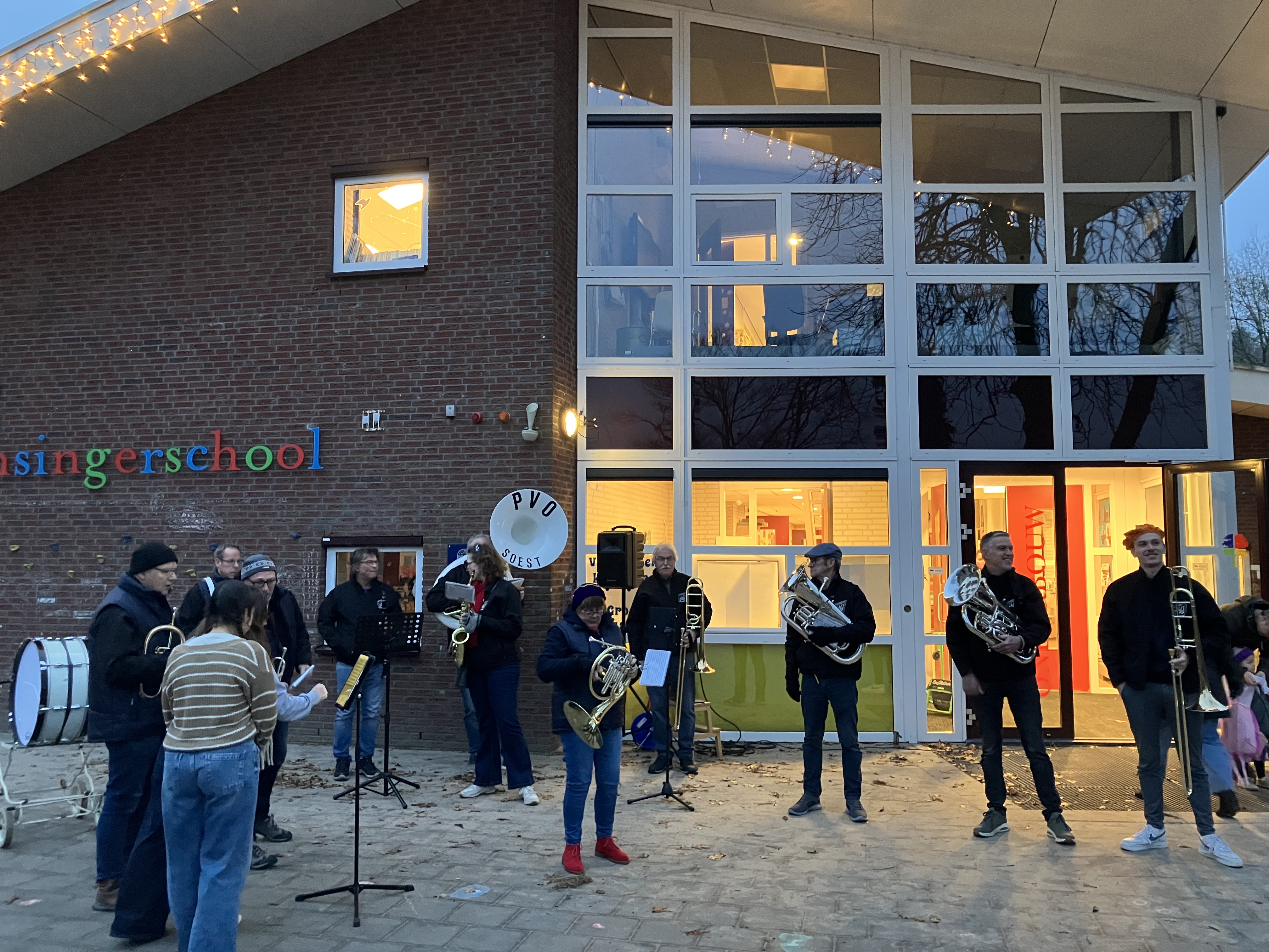 Het was weer spannend op het schoolplein van de Insingerschool of de Sint wel kon komen. Na een paar liedjes gespeeld door het dweilorkest WBAWWWB van PVO en heel hard meezingende kinderen kwam de Sint met een paar Pieten op een wel heel bijzonder voertuig, een soort heftruck, op het schoolplein gereden. Dit was zo georganiseerd, omdat het paard van Sinterklaas erg moe was en moest rusten in de stal om weer fit te zijn voor een hele drukke pakjesavond. Gelukkig toch weer goedgekomen voor de kinderen van de Insingerschool. Dit jaar speelde er ook een juf van de school mee op de bugel, een NTO-er uit Hoogland. Nog een paar laatste liedjes tot alle kinderen naar binnen zijn en dan kan het feest binnen beginnen. Dag Sinterklaasje!