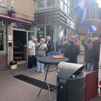 Dit jaar was de Eemlander Blaaskapel weer gevraagd om de lange wachtrij voor Banketbakkerij Verkley te vermaken met onze Egerländer klanken. Het was vroeg en nog een beetje fris, maar de muziek werd zeer gewaardeerd. Om klokslag 10:00 uur werd het publiek welkom geheten door onze burgemeester Metz die deze feestdag officieel opende, waarna het Wilhelmus werd gespeeld en meegezongen door het aanwezige publiek. Daarna volgde het Oranje Boven en nog een paar stukken uit ons repertoire. Met de Windrosen Polka werd ons optreden beëindigd en kon iedereen gaan genieten van koffie en oranje tompouce.